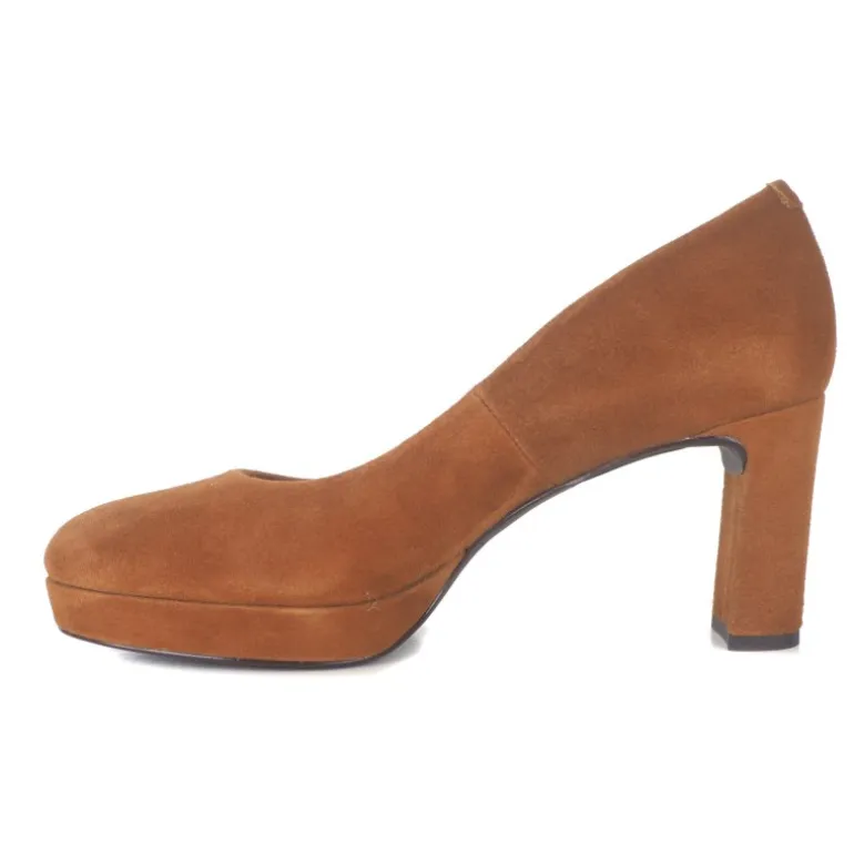 Meget klassisk og elegant pumps fra Unisa i cognac ruskind. Skoemn er med rund snude og en hælhøjde på 7,5 cm, samt lidt plateau.