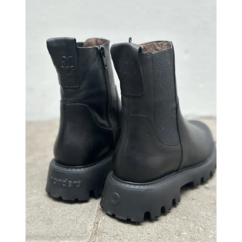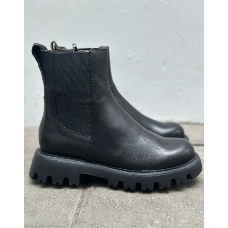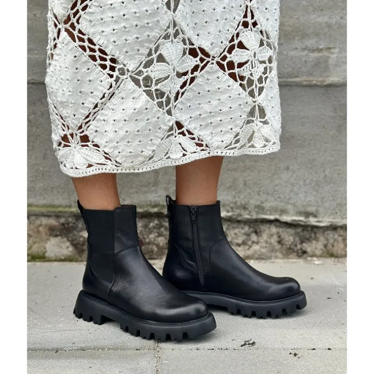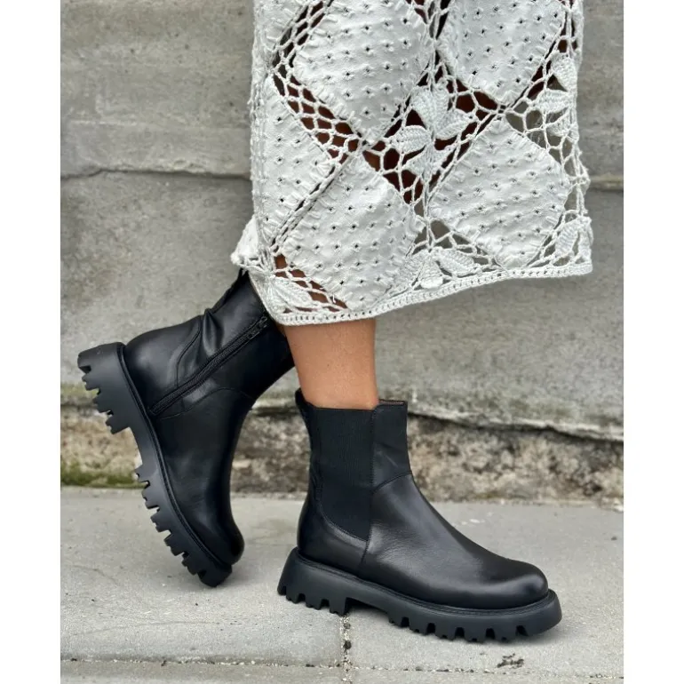 Meget smart ankelstøvle fra Wonders, i sort skind med lidt grovere gummisåler. Støvlen har lynlåse på indersiden, og et smart elastik stykke på ydersiden, som giver en fed detalje. Støvlen er dejlig let, og er helt fantastisk komfortabel at have på.